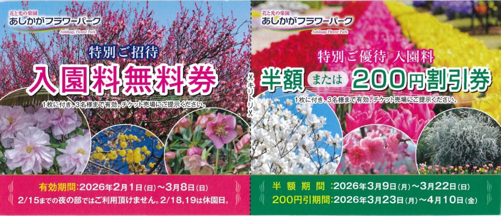 足利フラワーパーク優待割引券追加! 2026.02.09 2026年2月1日(日)~2026年4月10(金)の期間ご利用できる優待券になります。 提携施設一覧、またはこちら☞足利フラワーパーク優待割引券申込みからお申込み下さい。