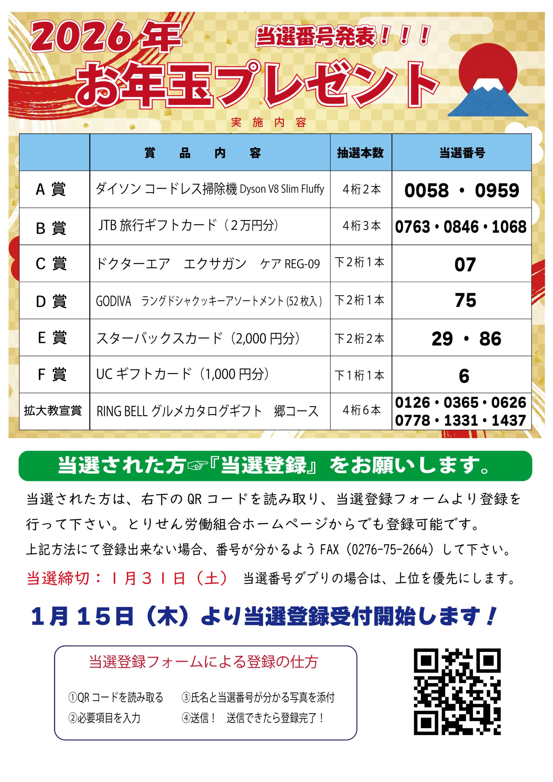 組合員を対象とした『2026年お年玉プレゼント』の抽選番号は、とりせん労働組合から送られてきた年賀ハガキに記載されています。
